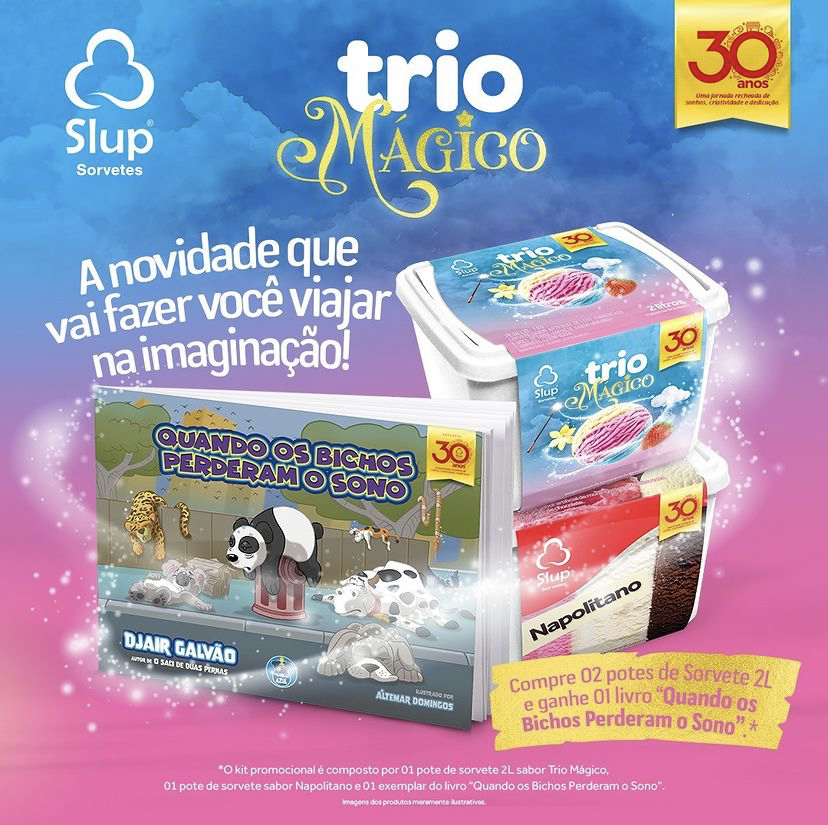 A campanha Slup 30 anos, em parceria com a Palhação Azul Editora, destaca no Instagram (@slupsorvetes) aspectos do meu trabalho como autor do livro Quando os bichos perderam o sono – que integra o pacote de produtos voltados para consumidores da marca no Dia das Crianças de 2021. A promoção presenteia quem adquire o kit Trio Mágico (veja detalhes abaixo).